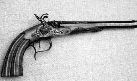 Капсюльный дуэльный пистолет работы тульского мастера Михайлова. 40-е годы XIX века. Обратим внимание на большой угол наклона рукоятки и шпору на спусковой скобе — считалось, что и то, и другое способствует увеличению меткости стрельбы