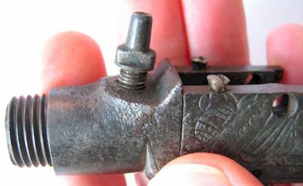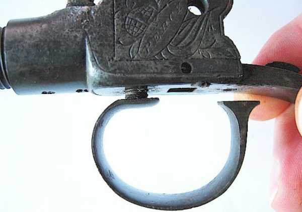 Казенная часть пистолета boxlock представляет собой камору для размещения порохового заряда и воронкообразный вход для установки пули.