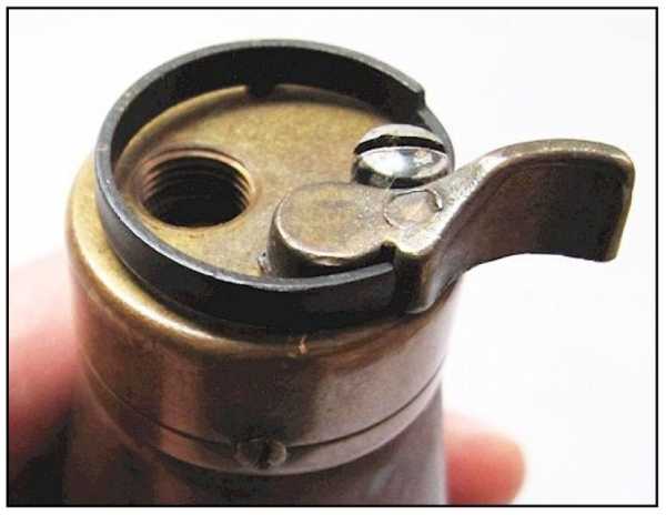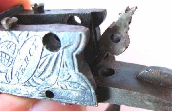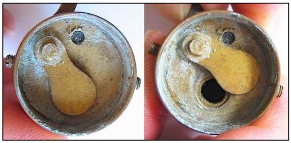 На левом фото показана крышка пороховницы, открывающаяся под действием подпружиненной кнопки. Зерна пороха, как правило, полностью заполняли камору казенной части. Масса навески пороха зависела от калибра пистолета boxlock.