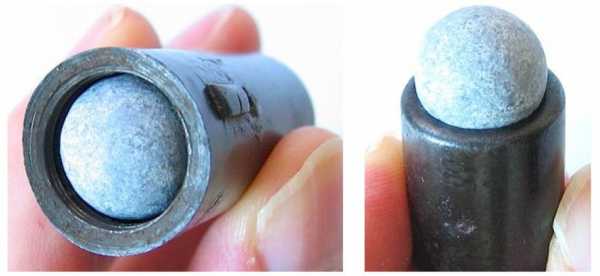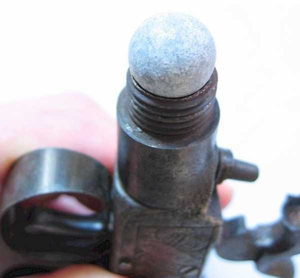 Круглая пуля, соответсвующего калибра устанавливается в воронкообразный вход казенной части, после чего к пистолету прикручивается ствол.
