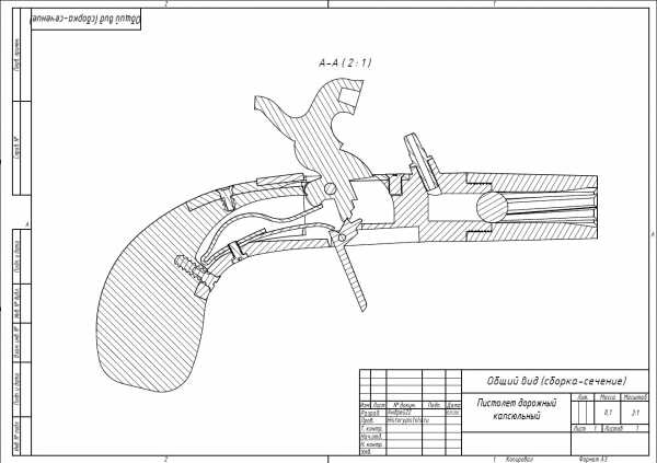 Сборочный чертеж демонстрирует устройство капсюльного пистолета и его замка boxlock. Ударно-спусковой механизм оружия состоит из курка с боевой пружиной и складного спуска с пружиной. Все части ударно-спускового механизма закреплены в рамке на двух осях, пружины крепятся к рамке с помощью одного винта. Подробные чертежи капсюльного пистолета с замком boxlock (boxlock percussion pistols blueprints) Вы можете заказать на странице Комплект чертежей дорожного капсюльного пистолета.