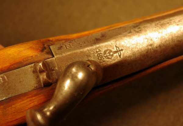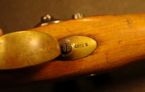 Π£ ΡΡΡΡΠΊΠΎΠ³ΠΎ ΡΠΎΠ»Π΄Π°ΡΡΠΊΠΎΠ³ΠΎ ΡΠ΄Π°ΡΠ½ΠΎΠ³ΠΎ ΠΏΠΈΡΡΠΎΠ»Π΅Ρ ΠΎΠ±ΡΠ°Π·ΡΠ° 1848 Π³ΠΎΠ΄Π°, Π²ΡΠΏΡΡΠ΅Π½Π½ΠΎΠ³ΠΎ Π² ΠΠΆΠ΅Π²ΡΠΊΠ΅ ΠΎΡΠ»ΠΈΡΠ°Π΅ΡΡΡ ΠΌΠ°ΡΠΊΠΈΡΠΎΠ²ΠΊΠ° ΠΈ Π½Π° ΡΡΠ²ΠΎΠ»Π΅. ΠΠΎΠΌΠΈΠΌΠΎ Π½ΠΎΠΌΠ΅ΡΠ° Ρ Π»Π΅Π²ΠΎΠΉ ΡΡΠΎΡΠΎΠ½Ρ ΠΊΠ°Π·Π΅Π½Π½ΠΎΠΉ ΡΠ°ΡΡΠΈ, Π² Π²Π΅ΡΡ Π½Π΅ΠΉ ΡΠ°ΡΡΠΈ ΡΡΠ²ΠΎΠ»Π° Π½Π°Π½Π΅ΡΠ΅Π½ΠΎ ΠΊΠ»Π΅ΠΉΠΌΠΎ ΠΠΆΠ΅Π²ΡΠΊΠΎΠ³ΠΎ Π·Π°Π²ΠΎΠ΄Π° Π² Π²ΠΈΠ΄Π΅ Π»ΡΠΊΠ° ΡΠΎ ΡΡΡΠ΅Π»ΠΎΠΉ. ΠΠΎΠ΄ Π½ΠΈΠΌ Π½Π°Π½Π΅ΡΠ΅Π½ Π³ΠΎΠ΄ Π²ΡΠΏΡΡΠΊΠ° Β«1851Β».