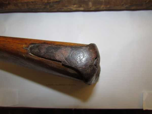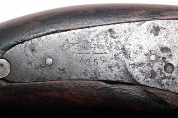 ΠΠ°ΡΠΊΠΈΡΠΎΠ²ΠΊΠ° Π·Π°ΠΌΠΎΡΠ½ΠΎΠΉ Π΄ΠΎΡΠΊΠΈ ΡΠ΄Π°ΡΠ½ΠΎΠ³ΠΎ ΠΏΠΈΡΡΠΎΠ»Π΅ΡΠ° ΠΎΠ±ΡΠ°Π·ΡΠ° 1848 Π³ΠΎΠ΄Π°, Π²ΡΠΏΡΡΠ΅Π½Π½ΠΎΠ³ΠΎ Π½Π° ΠΠΆΠ΅Π²ΡΠΊΠΎΠΌ ΠΎΡΡΠΆΠ΅ΠΉΠ½ΠΎΠΌ Π·Π°Π²ΠΎΠ΄Π΅ ΠΏΡΠ΅Π΄ΡΡΠ°Π²Π»ΡΠ΅Ρ ΡΠΎΠ±ΠΎΠΉ Π³ΠΎΠ΄ Π²ΡΠΏΡΡΠΊΠ° Β«1858Β», Π½Π°Π½Π΅ΡΠ΅Π½Π½ΡΠΉ ΠΏΠΎΠ΄ Π±ΡΠΊΠ²Π°ΠΌΠΈ Β«Π.Π.Π.Β». ΠΠ΅ΠΆΠ΄Ρ Π½Π°Π΄ΠΏΠΈΡΡΠΌΠΈ ΠΈΠΌΠ΅Π΅ΡΡΡ ΠΏΡΠ΅ΡΡΠ²ΠΈΡΡΠ°Ρ Π»ΠΈΠ½ΠΈΡ Ρ ΡΠΎΡΠΊΠΎΠΉ.