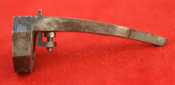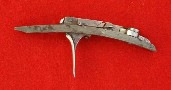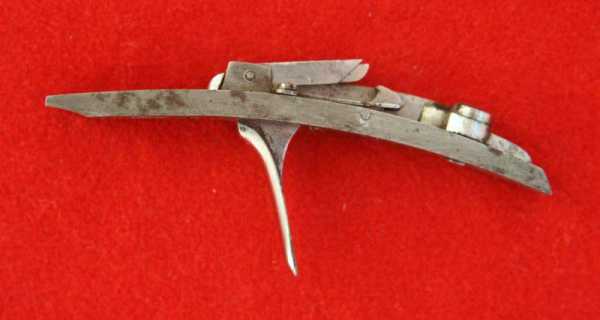 ΠΠ°ΠΏΡΡΠ»ΡΠ½ΡΠΉ Π·Π°ΠΌΠΎΠΊ ΠΏΠΈΡΡΠΎΠ»Π΅ΡΠ° ΠΎΠ±ΡΠ°Π·ΡΠ° 1848 Π³ΠΎΠ΄Π° ΡΠΎΡΡΠΎΠΈΡ ΠΈΠ· Π·Π°ΠΌΠΎΡΠ½ΠΎΠΉ Π΄ΠΎΡΠΊΠΈ, Π±ΠΎΠ΅Π²ΠΎΠΉ ΠΏΡΡΠΆΠΈΠ½Ρ, ΠΊΡΡΠΊΠ°, ΠΎΡΠΈ ΠΊΡΡΠΊΠ° Ρ ΠΏΠΎΠ²ΠΎΠ΄ΠΊΠΎΠΌ, ΡΠΏΡΡΠΊΠΎΠ²ΠΎΠ³ΠΎ ΡΡΡΠ°Π³Π° ΠΈ ΡΠ·Π΄Π΅ΡΠΊΠΈ. ΠΠΎΠ΅Π²Π°Ρ ΠΏΡΡΠΆΠΈΠ½Π° Β«VΒ» ΠΎΠ±ΡΠ°Π·Π½Π°Ρ, Π΅Π΅ Π΄Π»ΠΈΠ½Π½ΠΎΠ΅ ΠΏΠ»Π΅ΡΠΎ ΡΠ°Π·ΠΌΠ΅ΡΠ΅Π½ΠΎ Π² Π²Π΅ΡΡ Π½Π΅ΠΉ ΡΠ°ΡΡΠΈ Π·Π°ΠΌΠΎΡΠ½ΠΎΠΉ Π΄ΠΎΡΠΊΠΈ ΠΈ ΡΠ΅ΡΠ΅Π· ΠΏΠΎΠ²ΠΎΠ΄ΠΎΠΊ Π²ΠΎΠ·Π΄Π΅ΠΉΡΡΠ²ΡΠ΅Ρ Π½Π° ΠΎΡΡ ΠΊΡΡΠΊΠ°. ΠΡΡ ΠΊΡΡΠΊΠ° ΡΠΈΠΊΡΠΈΡΡΠ΅ΡΡΡ Π² Π±ΠΎΠ΅Π²ΠΎΠΌ ΠΏΠΎΠ»ΠΎΠΆΠ΅Π½ΠΈΠΈ Π²ΡΡΡΡΠΏΠΎΠΌ ΡΠΏΡΡΠΊΠΎΠ²ΠΎΠ³ΠΎ ΡΡΡΠ°Π³Π°. ΠΡΠΈ Π½Π°ΠΆΠ°ΡΠΈΠΈ Π½Π° ΡΠΏΡΡΠΊΠΎΠ²ΠΎΠΉ ΡΡΡΠ°Π³ ΡΠ΅ΠΏΡΠ°Π»ΠΎ ΠΎΡΠ²ΠΎΠ±ΠΎΠΆΠ΄Π°Π΅Ρ ΠΎΡΡ ΠΊΡΡΠΊΠ°, ΠΊΠΎΡΠΎΡΡΠΉ Β Π·Π° ΡΡΠ΅Ρ Π±ΠΎΠ΅Π²ΠΎΠΉ ΠΏΡΡΠΆΠΈΠ½Ρ Π½Π°Π½ΠΎΡΠΈΡ ΡΠ΄Π°Ρ ΠΏΠΎ ΠΊΠ°ΠΏΡΡΠ»Ρ, ΡΠ°Π·ΠΌΠ΅ΡΠ΅Π½Π½ΠΎΠΌΡ Π½Π° Π±ΡΠ°Π½Π΄ΡΡΡΠ±ΠΊΠ΅. ΠΠ°ΠΏΡΡΠ»Ρ Π²ΠΎΡΠΏΠ»Π°ΠΌΠ΅Π½ΡΡ ΠΏΠΎΡΠΎΡ ΠΎΠ²ΠΎΠΉ Π·Π°ΡΡΠ΄ Π² ΡΡΠ²ΠΎΠ»Π΅Β β ΠΏΡΠΎΠΈΡΡ ΠΎΠ΄ΠΈΡ Π²ΡΡΡΡΠ΅Π».