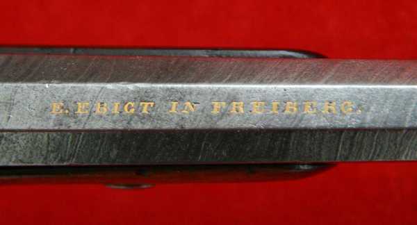 Π Π²Π΅ΡΡ Π½Π΅ΠΉ ΡΠ°ΡΡΠΈ ΡΡΠ²ΠΎΠ»Π° ΠΏΠΈΡΡΠΎΠ»Π΅ΡΠ° Π·ΠΎΠ»ΠΎΡΠΎΠΌ Π²ΡΠΏΠΎΠ»Π½Π΅Π½Π° ΠΈΠ½ΠΊΡΡΡΡΠ°ΡΠΈΡ Ρ ΠΈΠΌΠ΅Π½Π΅ΠΌ ΠΌΠ°ΡΡΠ΅ΡΠ° ΠΈ ΠΌΠ΅ΡΡΠΎΠΌ ΠΈΠ·Π³ΠΎΡΠΎΠ²Π»Π΅Π½ΠΈΡ ΠΎΡΡΠΆΠΈΡ Β«E. EBIGT IN FREIBERGΒ». ΠΠΌΡ ΠΌΠ°ΡΡΠ΅ΡΠ° ΠΠ΄Π²Π°ΡΠ΄Π° ΠΠ±ΠΈΡΠ° ΠΈΠ· Π€ΡΠ°ΠΉΠ±Π΅ΡΠ³Π° (Π‘Π°ΠΊΡΠΎΠ½ΠΈΡ) ΠΊΡΠ°ΠΉΠ½Π΅ ΡΠ΅Π΄ΠΊΠΎ ΡΠΏΠΎΠΌΠΈΠ½Π°Π΅ΡΡΡ Π² ΠΎΡΡΠΆΠ΅ΠΉΠ½ΠΎΠΉ Π»ΠΈΡΠ΅ΡΠ°ΡΡΡΠ΅ ΠΈ ΠΎΠ±ΡΡΠ½ΠΎ Π² ΡΠ²ΡΠ·ΠΈ Ρ ΠΈΠ·Π³ΠΎΡΠΎΠ²Π»Π΅Π½ΠΈΠ΅ΠΌ ΠΈΠΌ ΠΎΡ ΠΎΡΠ½ΠΈΡΡΠΈΡ ΡΡΠΆΠ΅ΠΉ. ΠΠΎΠ»Π΅Π΅ ΠΏΠΎΠ΄ΡΠΎΠ±Π½ΠΎΠΉ ΠΈΠ½ΡΠΎΡΠΌΠ°ΡΠΈΠΈ ΠΎ ΠΌΠ°ΡΡΠ΅ΡΠ΅ Π½Π΅ ΡΠΌΠΎΠ³ Π½Π°ΠΌ ΠΏΡΠ΅Π΄ΡΡΠ°Π²ΠΈΡΡ ΠΈ Π²Π»Π°Π΄Π΅Π»Π΅Ρ ΠΏΠΈΡΡΠΎΠ»Π΅ΡΠ°.