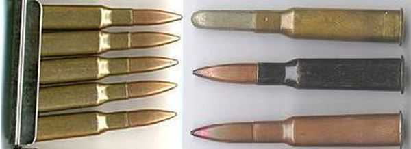 Справа, сверху вниз: патрон образца 1891 года с тупоконечной пулей и два патрона образца 1908 года с остроконечной пулей и стальной лакированной и латунной гильзами соответственно
