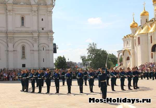 Церемония военно-исторического дефиле в летнее время в субботу на Соборной площади Московского Кремля.Расписание церемонии развода почётного караула