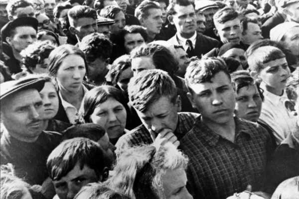 Москвичи слушают по радио заявление Советского правительства о вероломном нападении фашистской Германии на Советский Союз. Очень известная фотография первого дня войны.