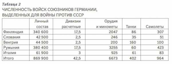 Вместе с Германией к войне с СССР готовились ее союзники: Финляндия, Словакия, Венгрия, Румыния и Италия, которые выделили для ведения войны следующие силы (см. таблицу 2). Кроме того, Хорватия выделила 56 самолетов и до 1,6 тыс. человек. К 22 июня 1941 г. на границе не было словацких и итальянских войск, которые прибыли позднее. Следовательно, в развернутых там войсках союзников Германии находилось 767 100 человек, 37 расчетных дивизий, 5502 орудия и миномета, 306 танков и 886 самолетов.