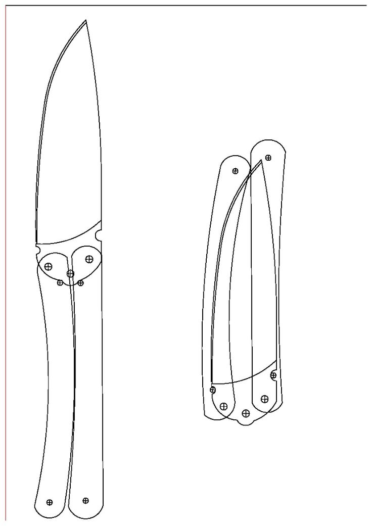 Чертеж ножа-бабочкиСхема ножа-бабочкиДалее следует нарисовать или найти и распечатать эскиз ножа. Для изготовления клинка лучше всего подойдет нержавеющая стать, толщиной от 2 до 4 мм. Также можно использовать старый диск от циркулярной пилы или старый нож. Во время изготовления рукояти лучше всего использовать мягкие металлы до 3 мм.