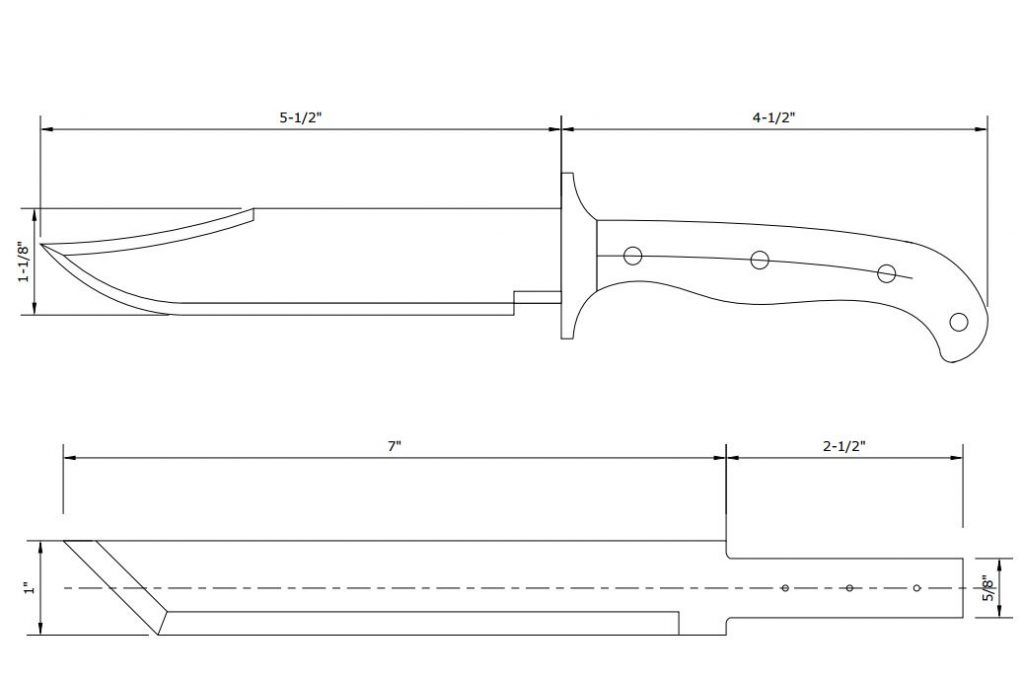 Чертеж охотничьего ножа более простой, поэтому его будет проще сделать. Однако с рукоятью придется немного попотеть и в идеале сделать её из дерева.