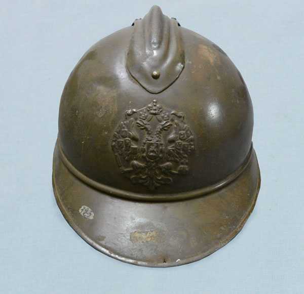 Французская каска Адриана (первый вариант М1915) была разработана генералом армии Огюстом Луи Адрианом в 1915 г. Она защищала бойцов как от осколков снарядов, так и от шрапнели. Шлем состоял из четырёх частей: полусферический свод шлема, передний и задний козырьки (оба с острыми окантованными краями) и гребень, прикрывающий вентиляционное отверстие и усиливающий защитные свойства шлема. Делался шлем из стального листа толщиной 0,7 мм, общим весом 700—800 грамм, варьирующимся в зависимости от размера, которых было три. Кожаный подшлемник состоял из 6—7 скреплённых вверху частей. Подбородочный ремень шириной 0,5 см был изготовлен из лошадиной кожи. Каски, поставляемые в Россию, имели только два отличия от своего французского аналога: фронтальная эмблема (в данном случае российский двуглавый орёл) и цвет – светлая охра. Вес шлема, подшлемник и подбородочный ремень были такими же, как и у касок, поставляемых французской армии[2]. В период войны ими снаряжались в основном ударные части, т.к. тыловые производства не справлялись с нуждами фронта.