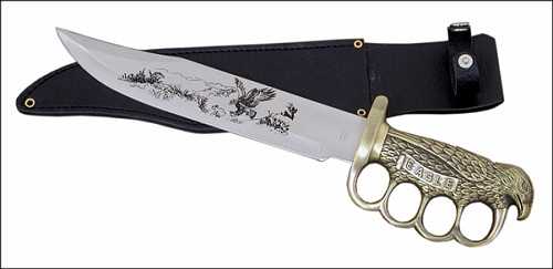 Появляются разнообразнейшие “охотничьи” ножи с гардами-кастетами. Первым, и пожалуй наиболее удачным, был нож “Eagle” фирмы United. Рукоять была отлита из очень качественной латуни, а вот клинок был из низкопробной нержавейки. А так как снимался клинок за 30 секунд с помощью отвертки, большинство этих ножей лишались клинков сразу после покупки и продолжали свою жизнь в качестве кастетов.