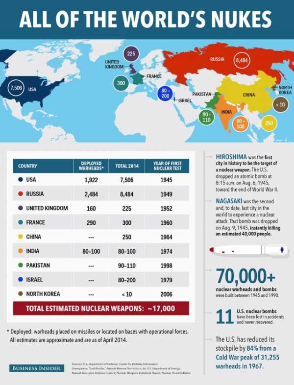 США, Россия, Великобритания Франция, Китай, Индия, Пакистан, Израиль и Северная Корея обладают примерно 17 000 ядерных зарядов, согласно последней оценке из Центра по контролю вооружения и нераспространения.