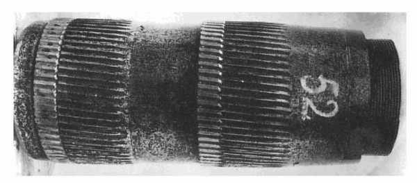 с отвинченной головной частью, хорошо видны нарезы в медных поясках и желобки на корпусе снаряда