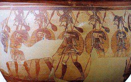 Известное изображение «марша воинов» на вазе из Микен. Обратите внимание на листовидные наконечники и странной формы вымпелы на копьях.