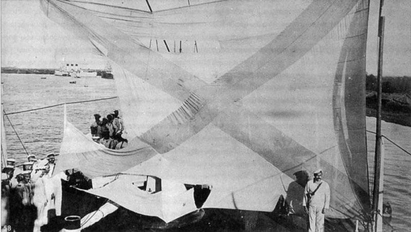 «В исходе первого часа Императорская яхта «Штандарт», шедшая в кильватере крейсера «Аврора», стала медленно приближаться к месту своей стоянки напротив Царской пристани. Ровно в 2 часа дня Императорская яхта стала на якоре. С сопровождающих яхту военных судов раздавались звуки музыки. В городе раздавался колокольный звон».