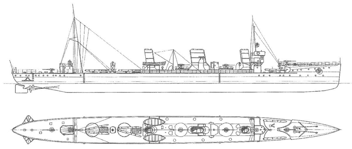 Вооружение: 4—102 мм орудия, 4 двухтрубных 450 мм ТА, мог принимать 50 мин. Экипаж – 117 человек.