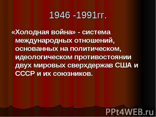 Холодная война — это термин, который используется для описания военного, экономического и политического противостояния двух военно-политических блоков во главе с СССР и США во второй половине XX века. В прямом смысле войной это нельзя назвать, так как непосредственного военного столкновения между участниками конфронтации не было, что не мешало им поддерживать враждующие стороны в череде конфликтов по всему земному шару. Соперничество между двумя сверхдержавами сопровождалось гонкой вооружений — как обычного, так и ядерного, — периодически ставившей мир на порог Третьей мировой войны. Также в противостоянии большое значение придавалось идеологии — в борьбе за гегемонию в мире столкнулись коммунизм и капитализм.