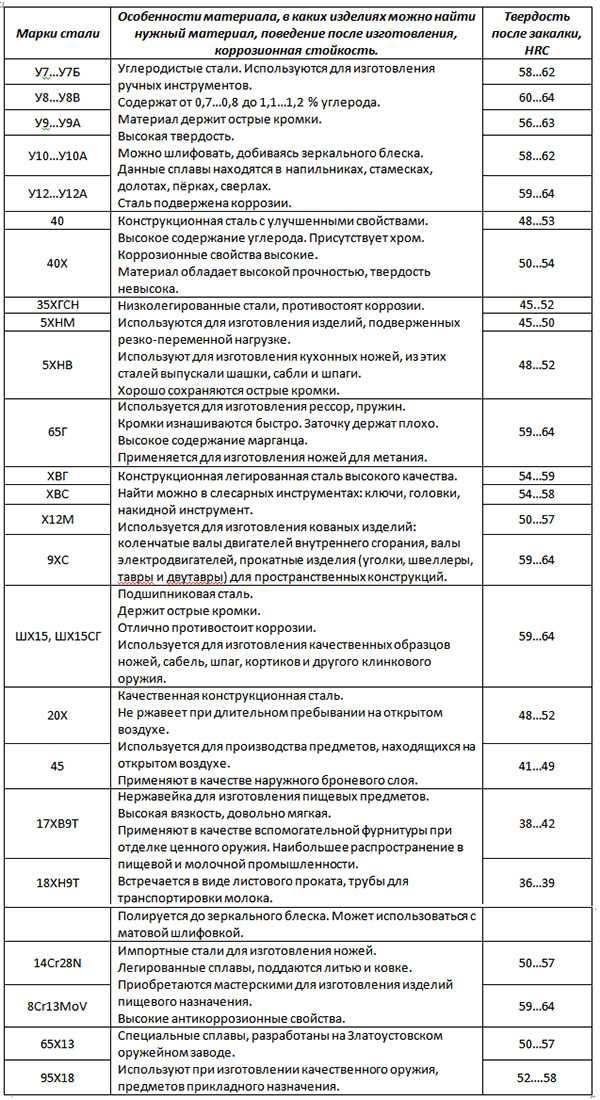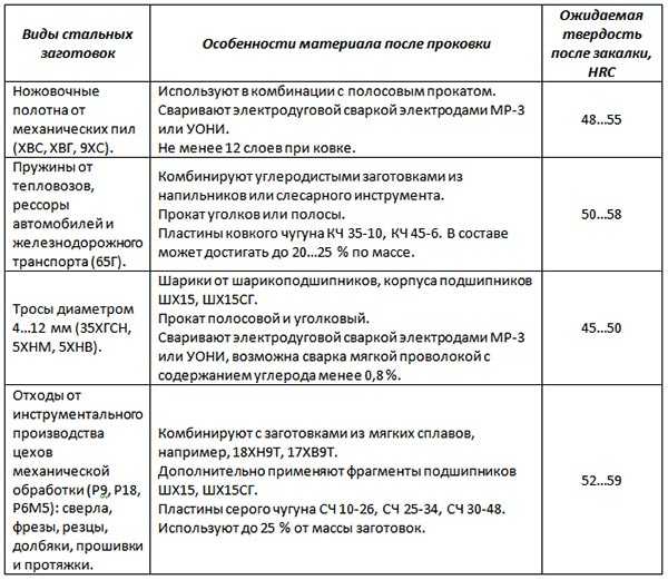 Сделать булатную сталь несложно, для его производства используют стали и сплавы с заранее заданными свойствами. Применяют готовые изделия и специальные слитки. Кузнечные мастерские пользуются металлическим ломом или деталями, приобретаемыми в торговой сети. В таблице приведены материалы, которые чаще всего применяют для изготовления кованых предметов.