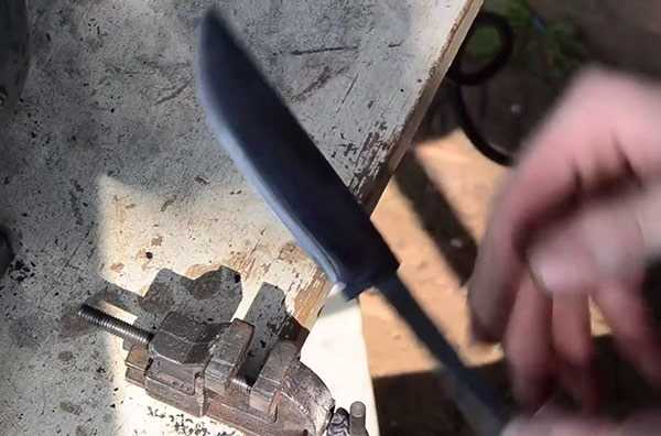 Приваривается будущая режущая кромка. Для нее используется полоса от напильника, в которой использована сталь У10. На кромке твердость составить HRC 60…63. Остальная часть лезвия останется пластичной.