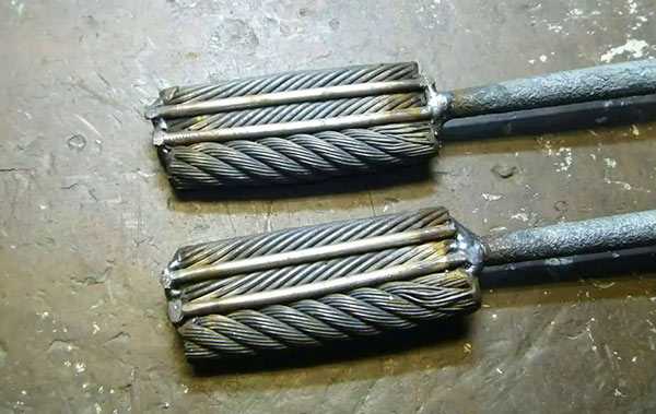 Из нескольких отрезков троса готовят заготовки. Их сваривают с помощью стержней из нержавеющей стали. Трос представляет собой жесткий металл, а нержавейка – это мягкий, пластичный материал.