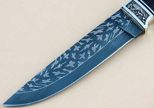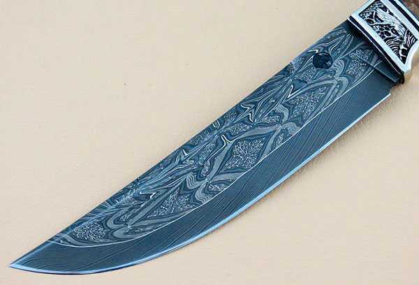 Следы этого коктейля в готовом клинке можно увидеть невооруженным взглядом. Характерный узор на лезвии «дамаска» оптический эффект неравномерного распределения углерода. «Дамаск» обладает своим неповторимым «лицом», своим рисунком, своей красотой в железе. Гомогенный материал ровный по раскрасу, не так интересен. Его, как правило, разрисовывают, либо растравливают, чтобы создать, какой-то образ.