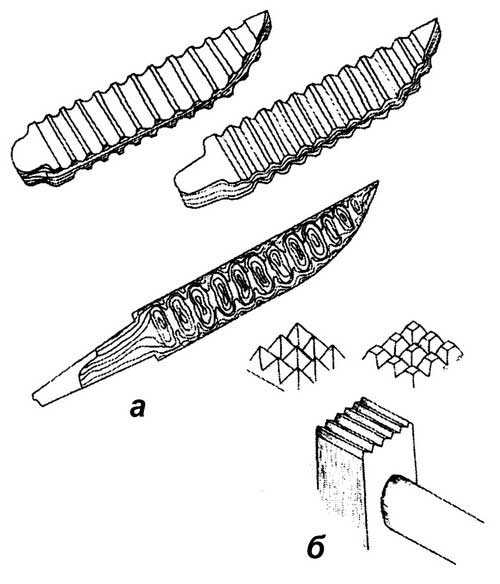 Существовало много способов изготовления узорчатых клинков. Например, скручивали в виде каната полосы или куски проволоки, имеющие различное содержание углерода и потому разную твердость. Такая «плетенка» проковывалась, а точнее, сваривалась под молотом после нагревания. Поскольку куски были разного состава, на клинке при травлении проявлялся узор. Варьируя способы сплетения проволоки или полос, можно было получить различные узоры на поверхности клинка.