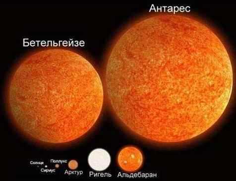 На небе также были найдены звезды огромных размеров и светимостей. Одна из таких звезд, Бетельгейзе, в 900 раз больше Солнца по диаметру и излучает в 60000 раз больше света, чем наше дневное светило! Другая звезда, VY Большого Пса (читается как «вэ-игрек») в 1420 раз больше Солнца по диаметру! Если VY Большого Пса поместить на место Солнца, то поверхность звезды будет находиться между орбитами Юпитера и Сатурна, а все планеты с Меркурия по Юпитер (включая Землю!) оказались бы внутри звезды!