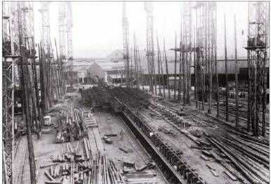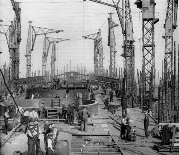 Вид сверху верфи Джона Брауна, на корпусе линейного крейсера «Худ» выполняются финальные перед спуском работы.