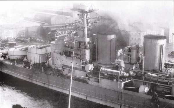 Как видно, у корабля полностью разрушена носовая часть и дымовые трубы, однако сохранились башни ГК, носовая надстройка с мостиком и боевой рубкой, кормовая надстройка с остатками ангара для самолета-корректировщика.