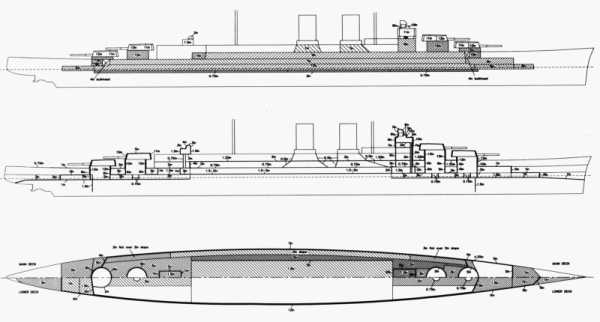 Горизонтальная защита корпуса также была очень… скажем так, разноплановой. Ее основу составляла броневая палуба, причем следует выделить три ее участка; в пределах цитадели, вне пределов цитадели в районе бронированного борта и вне пределов цитадели в небронированных оконечностях.