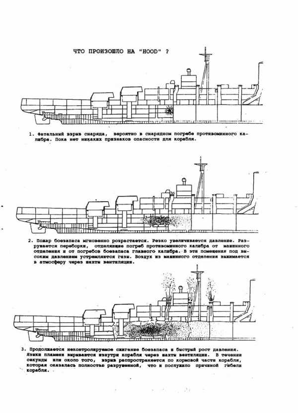 Дело в том, что очевидцы трагедии описывали такую последовательность событий непосредственно перед взрывом корабля: сперва, в 05.56 попадание 203-мм снаряда с «Принца Ойгена» вызвало сильный пожар в районе грот-мачты. Как ни странно, там оказалось достаточно приличное количество бензина (речь идет о сотнях литров) которые вызвали пожар, а поскольку огонь охватил районы кранцев первых выстрелов 102-мм зениток и зенитных установок UP, которые немедленно начали взрываться, то тушение его было затруднено. Затем в «Худ» с интервалом в минуту попали снаряд с «Бисмарка» и затем – с «Принца Ойгена», не причинившие ему угрожающих повреждений, а затем произошла катастрофа.