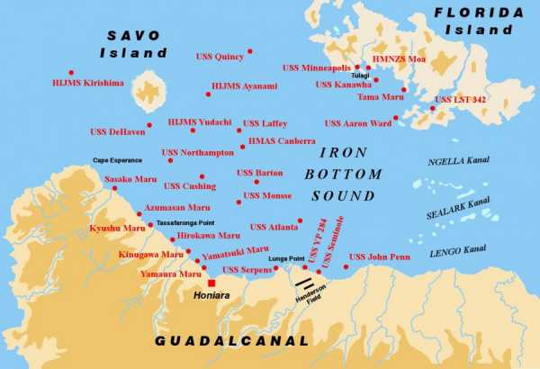 Пролив Железное дно разделяет острова Гуадалканал и Флорида. Морские сражения развернулись в центре и в северо-западной части пролива, у острова Саво, и у мыса Эсперанс.