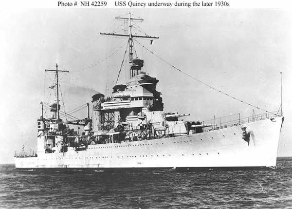 «Куинси» в момент своей гибели, подсвеченный прожекторами японских кораблей в ночном бою у острова Саво 9 августа 1942 года. Корабль объят сильным пожаром, виден дифферент на корму.