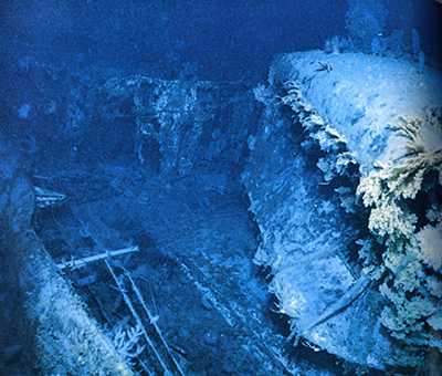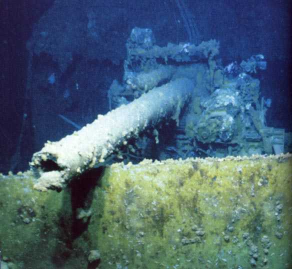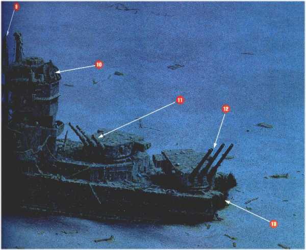 У корабля напрочь отсутствует все, кроме орудийных башен. Все эти картинки сделаны на основе подводных фотографий.