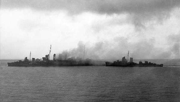 Американские эсминцы снимают экипаж с тонущего крейсера «Канберра».