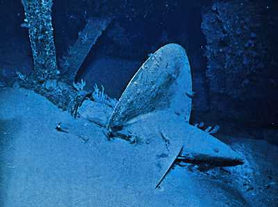 Глубоководных фотографий корабля найти не удалось, мало кадров и в фильме. Есть такое же изображение корабля на дне из книги Балларда. Видно еще хуже, чем «Куинси», но это все, что есть. У корабля нет всех трех труб, сорвана броневая крыша на башне ГК №2, повреждена носовая надстройка. Больше что-либо разглядеть на этой картинке трудно.