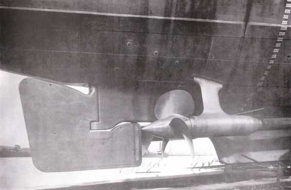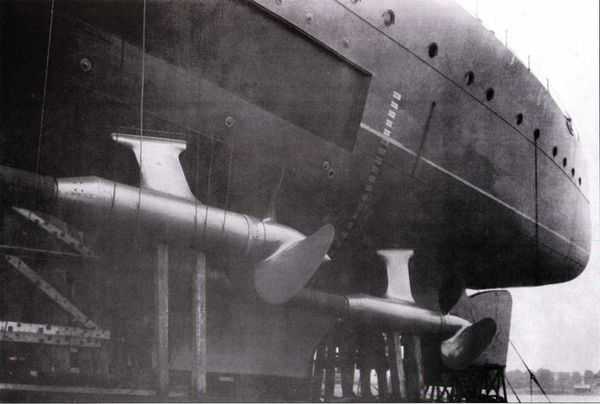 Крупные планы кормы линейного крейсера «Худ» – руль и гребные винты. Диаметр гребного винта – порядка 15 футов. Каждый винт отлит из бронзы в одну деталь.