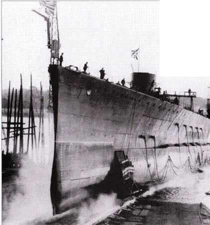 Спуск «Xуда» на воду состоялся 22 августа 1918 г. На тот момент британский линейный крейсер являлся крупнейшим кораблем в мире. Перед спуском па корабле была смонтирована большая часть палубы, но монтаж машин толком не начинался, полностью отсутствовало вооружение, почти не было надстроек. Тем не менее масса корабля перед спуском составляла 22 000 т – больше, чем у любого другого полностью оснащенного и снаряженного корабля мира! На снимках вверху и внизу – корпус «Худа» на воде с установленным бронепоясом.