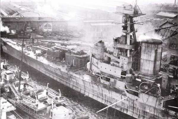 Внизу: «Худ» у достроечной стенки на заключительной стадии монтажных работ. Снимок сделан 2 декабря 1919 г. на верфи Джона Брауна. В процессе монтажа -15-дюймовые носовые башни главного калибра.