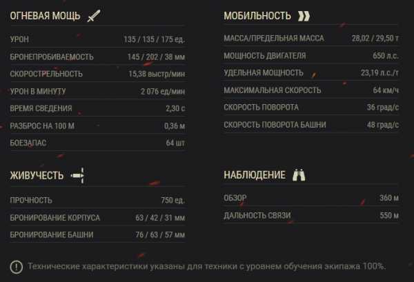 Реализовать урон помогают удобные углы вертикального наведения -8…+15° и неплохая точность 0,35. Бронепробиваемость базовым снарядом у танка одна из лучших 145 мм. Время сведения не выделяется среди СТ 6 уровня.