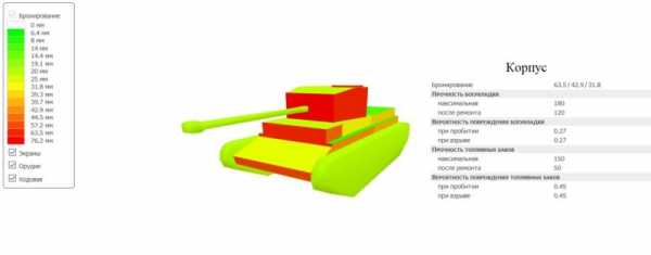 Корпус танка менее прочный. Тут самая сильная часть — это также лоб со значением 63 мм. Толщина борта корпуса равна 43 мм, а вот корма — самое уязвимое место, всего 31 мм.