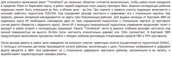 — Рельефометрическая система Terrain Contour Matching (TERCOM) — сканирует подстилающий рельеф и сравнивает полученные данные с радиолокационными снимками, заложенными в память ракеты.