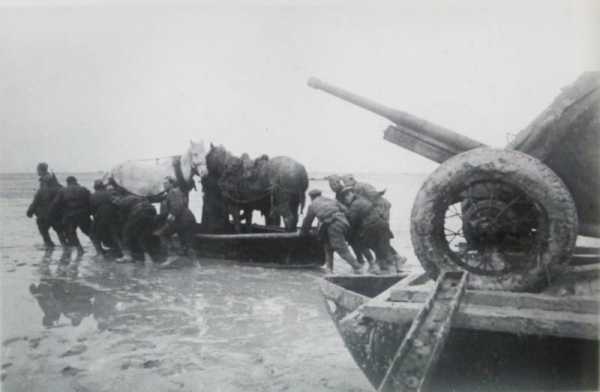 21. Советские войска переправляют боевую технику и лошадей через Сиваш. На переднем плане 45-мм противотанковая пушка. Декабрь 1943