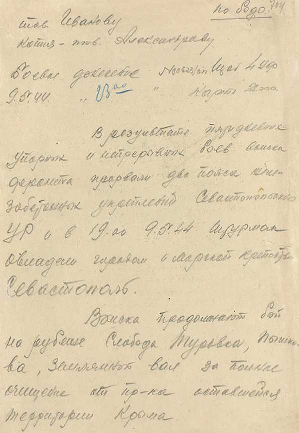 Боевое донесение штаба 4-го Украинского фронта об овладении городом и морской крепостью Севастополь
