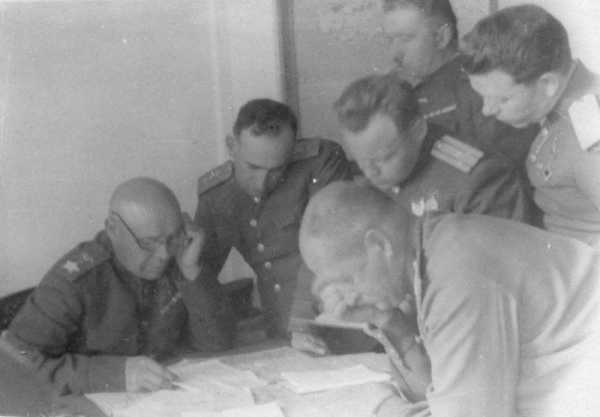 16. Начальник штаба 4-го Украинского фронта генерал-лейтенант Сергей Семенович Бирюзов, член Государственного комитета обороны маршал Советского Союза Климент Ефремович Ворошилов, начальник Генерального штаба маршал Советского Союза Александр Михайлович Василевский на командном пункте 4-го Украинского фронта. Апрель 1944