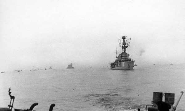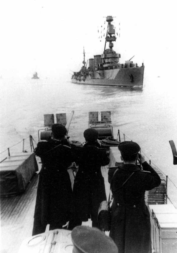 18. Черноморская эскадра возвращается в освобожденный Севастополь. На переднем плане — гвардейский легкий крейсер «Красный Крым», за ним виден силуэт линкора «Севастополь». 05.11.1944