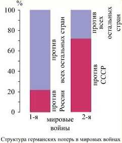В целом, как видно из вышеприведенных данных, на советско-германский фронт пришлось порядка 70 % потерь немецко-фашистских войск. Таким образом, ситуация с распределением потерь и, следовательно, с соотношением напряженностей боевых действий по фронтам 2-й мировой войны была зеркальной к ситуации во время 1-й мировой: