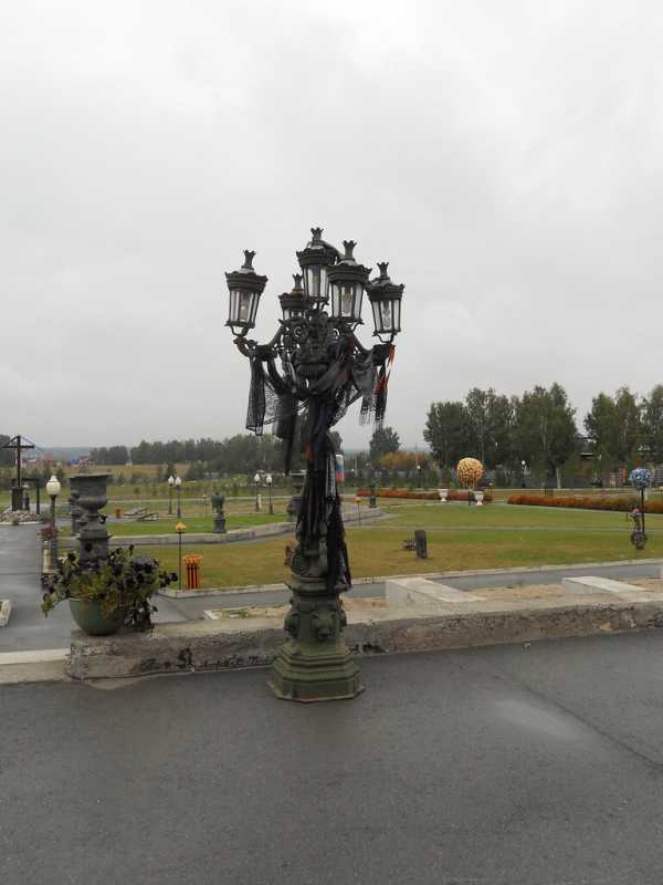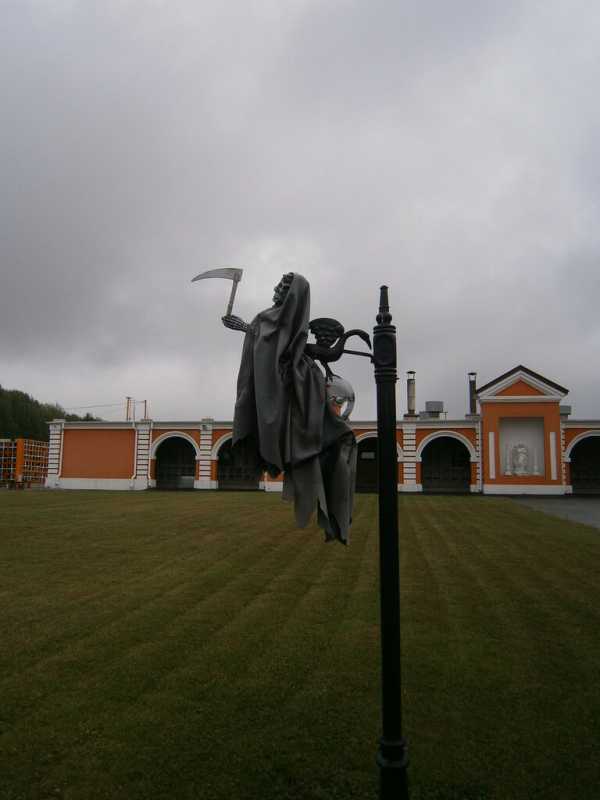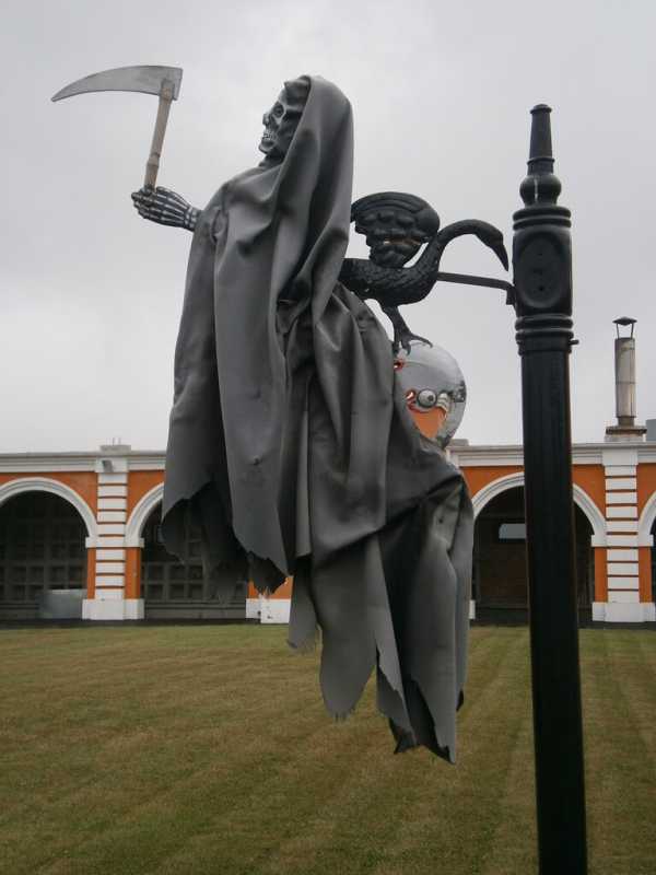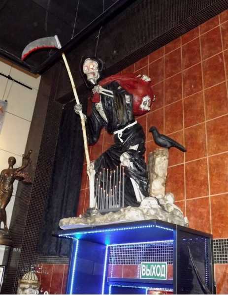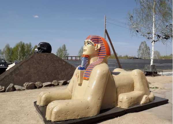 Во дворе, рядом с мрачным пирамидальным курганом, увенчанным черепом, возлежит ярко раскрашенный сфинкс. Добродушный и какой-то дурашливый. Но он тоже тут по делу – как страж египетского загробного мира.